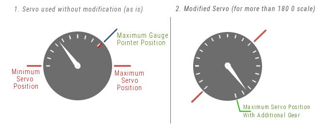 Note that the ratio of the final gears in this servo was more than 3:1 and with skipping the last gear the rotation angle was increased from 180° to 580°. Thus, when using this modified servo for a gauge with a scale less than 360°, not the entire range of the servo is used..