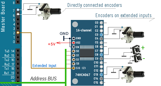 To work with SimVimX all encoders should be connected to multiplexer inputs (or to master board pins) directly, without using any pull-up resistors, pull-down resistors or diodes.