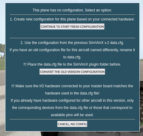 Before selecting this option, make sure the plugin folder contains the old SimVimX v.2 configuration file (data.cfg), then click the button (it will do nothing if the data.cfg file is missing). The plugin will use the data from this file to create an aircraft configuration for the new version 3.**